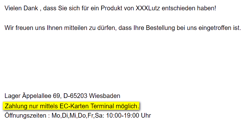 Vor drei Wochen habe ich bei XXXLutz Ware bestellt. Bei der Zahlung (bar) an der Kasse wollte ich sofort alles begleichen. Das wurde mit „Ist nicht nötig, die Hälfte ist ausreichend“ abgebügelt. Also zahlte ich nur die Hälfte.